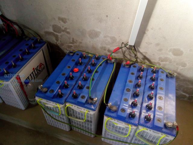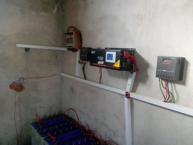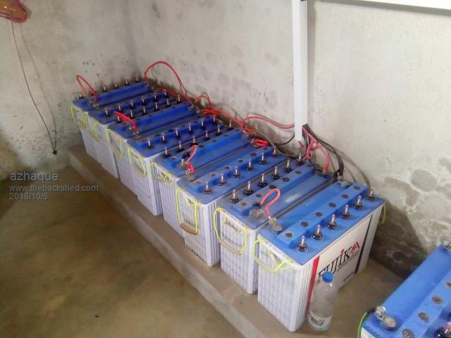 I forgot to post the pics of other inverter and battery (the sun is shining on the inverter thru the garage ventilator). This is 48VDC system with the inverter rated 5KW. 7.5KWs of solar power is fed to this inverter/battery pair using 2 nos. 6048s (can be seen in the pic). This system is dedicated to run the fridge and the deep freezer and other power devices in the house.