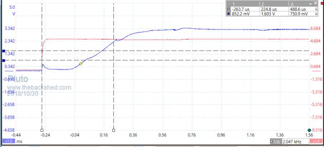 In addition to my earlier post. ![]() Blue trace: 3.3V powerline for PIC Red trace: USB powerline time scale in ms. Vertical cursors: 1) Connecting USB, 2) PIC's power at 2.3V (min operation voltage for PIC). 488.6 us before we have 2.3V. /Fred |