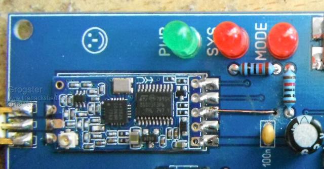 I thought I probably should do a quick continuity test with my multi-meter(set on junction test, which only allows about 0.5mA of current to flow). OK, circuit through SET line to MM chip. Circuit through TXD to MM chip. ......NO circuit from RXD to MM chip. Well, well, well. Checked a few times, and pulled out the MM chip to be sure. No circuit. Checked one of the other boards, and there WAS a circuit on those ones. I would have to pick up the dud one to assemble. Go figure.