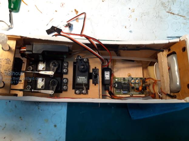 From left to right: top=receiver lower the 2 servo's for elevation and rudder), centre the throttle servo and power switch, right the telemetry input module (CE mark) and finally the PICAXE circuit. Extreme right you can still see part of the fuel tank.