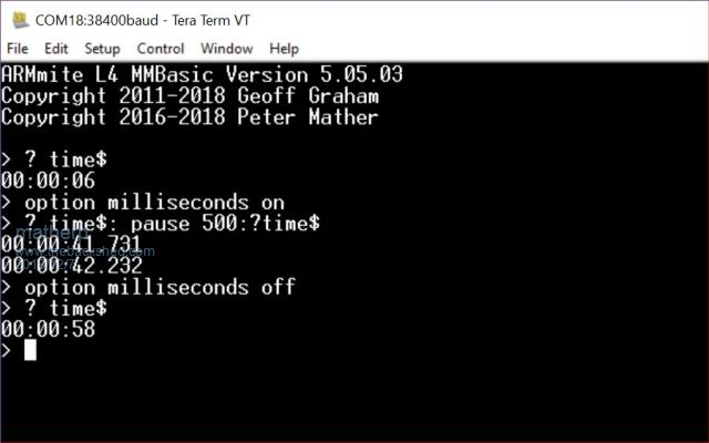 No, too nasty Try this: 2018-12-08_195738_ArmmiteL4.zip Here is my test program CPU 8 Option milliseconds off a$=Time$ Do Loop Until a$<> Time$ Option milliseconds on Pause 990 Do Pause 999 Print Time$ Loop |