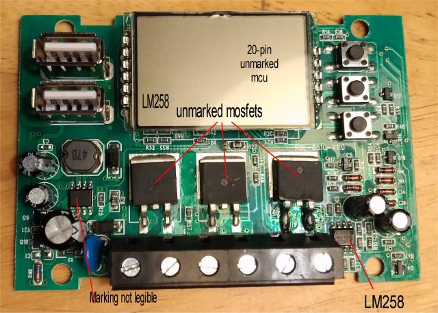 At the curiously named chinese electronics store, newfrog.com, I saw this "Solar Charge Controller" for $8.95 US: https://www.newfrog.com/product/12v-24v-lcd-auto-work-solar-charge-controller-pwm-dual-usb-output-charger-251664.01 ![]() I'm interested in the solar aspect later, but right now it appears to do a lot of what I have been hoping to do to maintain a battery charge from a mains source (a 15V DC wall adapter). Of course, it says not to use anything but a solar source: "The charge regulator is only suitable for regulating solar modules. Never connect another charging source to the charge regulator." ![]() But why not? I bought 2 of them so I could tear one down to see if anything clearly could not handle a 15V wall wart. But I'm not so experienced, so I'd like other eyes to look. Tear-down is too strong a term. The case snapped open, and a pcb with components on only one side appeared. ![]() The 20-pin mcu is under the elevated LCD, with markings sanded off. There are two LM258s, 3 mosfets with markings removed, and an 8-pin IC near the caps and inductor, also unmarked. I don't see any inherent reason why I couldn't feed 15 volts where the solar is to come in and maintain my 12V 7Ah SLA battery with over-voltage and under-voltage protection for my (light) load. Of course, it doesn't have any safety markings, but neither would anything that I made. If it works, for less than $9, it's not worth my spending any more time trying to make something myself. What thoughts do shedders have? PicoMite, Armmite F4, SensorKits, MMBasic Hardware, Games, etc. on fruitoftheshed |