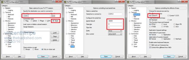 in the above image i have set my com port (COM12) , serial connection , 38400,8,1 and the Control-H character for backspace. You can save this to Putty Defaults, or a custom setup file so you don't have to do this every time