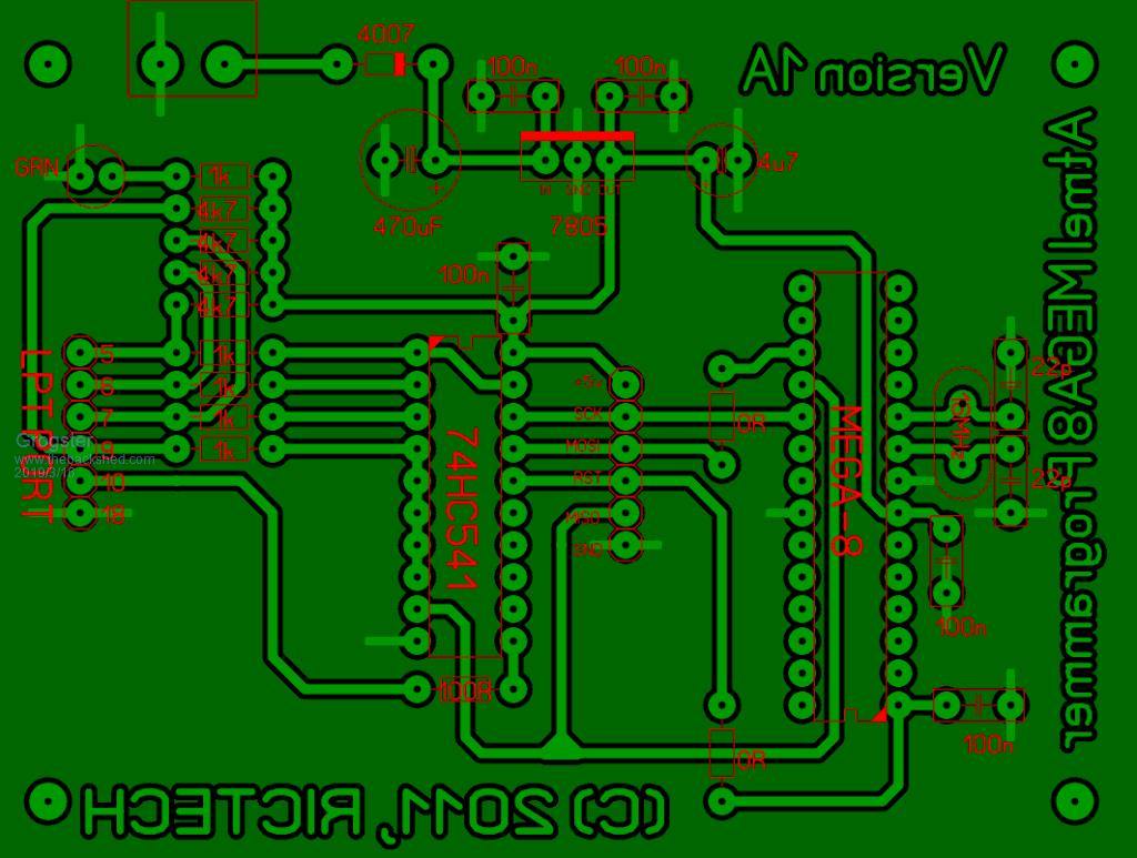 I used to have a thing for programming the MEGA8's used in DIL format in the TellyMate TV adaptor I was using for a few years. Your post has made me have a rethink. Perhaps I can re-research what I was using for that. I see that the OpenLog also uses a MEGA8 chip, just in QFP footprint, so I think I will look into this a little more. I'm notorious for doing this - sadly. ![]() I biffed all the HC12's that were off-frequency when I found them, and then a member said I should not be so hasty, and so retrieved them from the bin, and put them in a little pottle of their own clearly marked as the clones. I do still plan to use these for my own projects around the house, or for my train-controller project - if I ever get that one finished! ![]() EDIT: I found the PCB pattern for the MEGA8 programmer from eight years ago: This was single-layer, and eight years ago, so it is not as neat as my recent designs. ![]() It obviously worked from the printer port. I have no idea now what application that would have been, but I suspect it was a 3rd party programmer and software. I would not have designed this circuit, I would have found it on the net and just done the layout for it. I wonder what LPT software programmer I would have been using? Anyone got any ideas? Smoke makes things work. When the smoke gets out, it stops! |