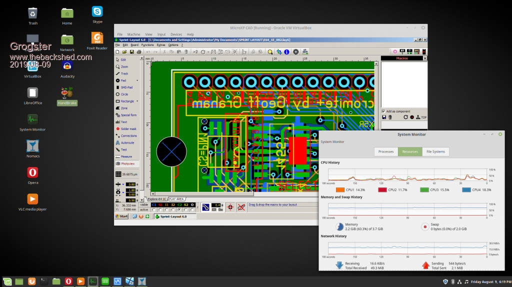 Note that this is running the Linux host and the XP Virtual Machine aswell, with Sprint Layout PCB CAD running in the XP VM, along with Opera web-browser, and all this is only sucking 2.3GB of RAM - amazing.