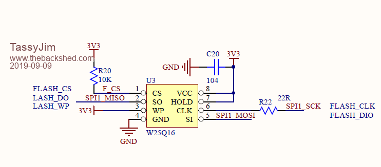 Note the 3.3Vsupply and also the WP and HOLD pins tied to 3.3V