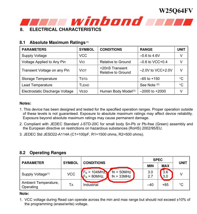I am yet to determine what Fr really means but if operating at 80MHz/33Mhz the max Vcc seems to be 3.0v