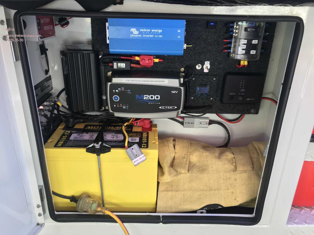 Gidday Lizby, It was a fluke that the amp draw and AH are both 3.9 abit + and -. I read the analogue voltage from the current sensor every program loop. I have a timer every second that averages those voltage readings (about 200 of them I recall) and then converts to Amps. The Amps for that second are then added to the cumulative Ah. eg. Ah = Ah + (Amps/3600). - Amps is discharge from battery and + is charging. This gives a approximate Ah position. To start I zero the Ah when the battery is float charged and so the Ah goes neg with discharge and comes back up with charging. It is rather difficult to calculate the actual Ah remaining in a battery as it will change with temp, discharge rate and heat loss when charging. For the moment Ah when discharging is calculated 1:1 but I take a small percentage off the charging/positive amps so account for the losses. I kinda gets back to zero but one problem is is that the REDARC BCDC and CTek M200 have different float voltages. I am considering automatically zeroing when float voltage is detected for a given period. For the moment the Ah gives a pretty good indication and the actual battery voltage does too. The screen is a SH1106 128x64 1.3" on I2c. Am using Matherp's driver found on the backshed. It is a CFunction so I don't know how to tinker with it and I think Pete as butted heads with this type of display but if anyone has any clues how to get to the 2 right columns that would be appreciated. Cheers, Anthony. |