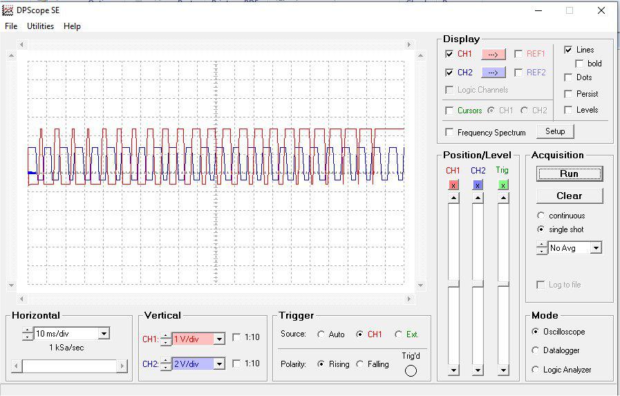 Here is what it looks like on my PC scope, DPScopeSE, the on-time ramped at each zero-crossing; the zero-crossing trigger is blue, and the on-time is red.