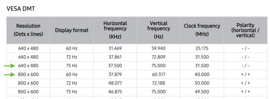 Assuming the CMM2 is putting out the standard VESA DMT (Display Monitor Timings) for these 2 output resolutions (800x600@60Hz & 640x480@75Hz), then you would assume that all HDMI capable displays should support these basic resolutions? Unless there is perhaps some +/- sync polarity support issue? The below supported resolutions table is from a recent model Samsung TV. Note that the 640x480 support is -/- sync polarity, whereas the 800x600 support is +/+ sync polarity. Presumably these are the normal / expected sync polarities for these resolutions? A quick look at the VESA DMT specifications did not appear to list specific sync polarity requirements for these resolutions (but I may not have read deep enough). |