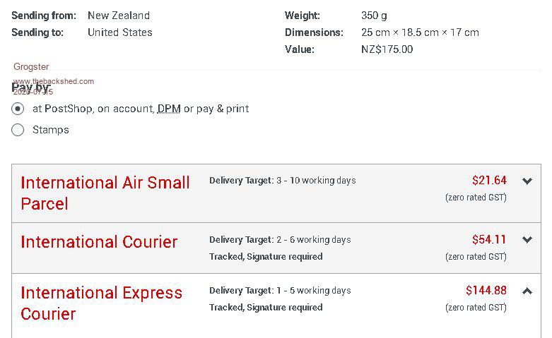 Or the more expensive DHL for US$50 to Australia, US$95 to UK or USA - $144 PER PACKAGE in my money for those last two via DHL out of NZ.  Bloody expensive!