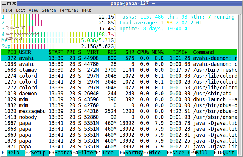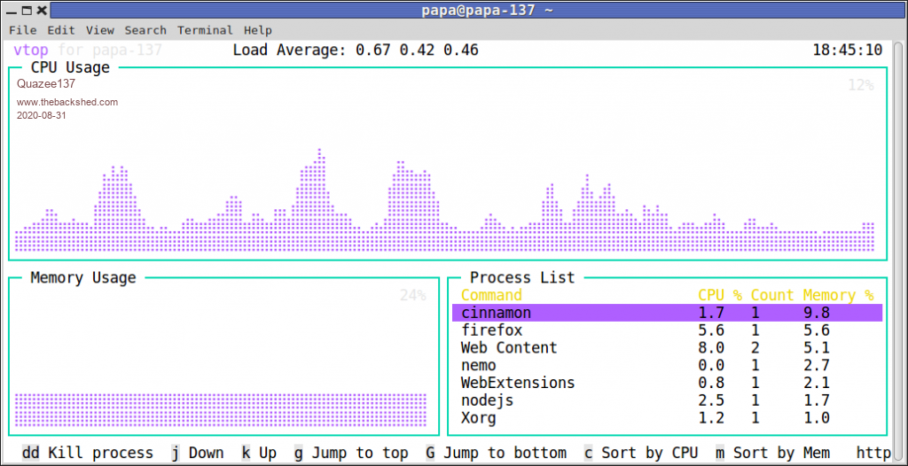 I use htop there is also vtop I have not installed it yet as I'm getting ready to move from mint 18.2 to 20 on my new box. ![]() and I have hot keys to kill java when minecraft locks up. ![]() couldn't wait so loaded up vtop very nice look to it. ![]() Edited 2020-08-31 11:46 by Quazee137 |