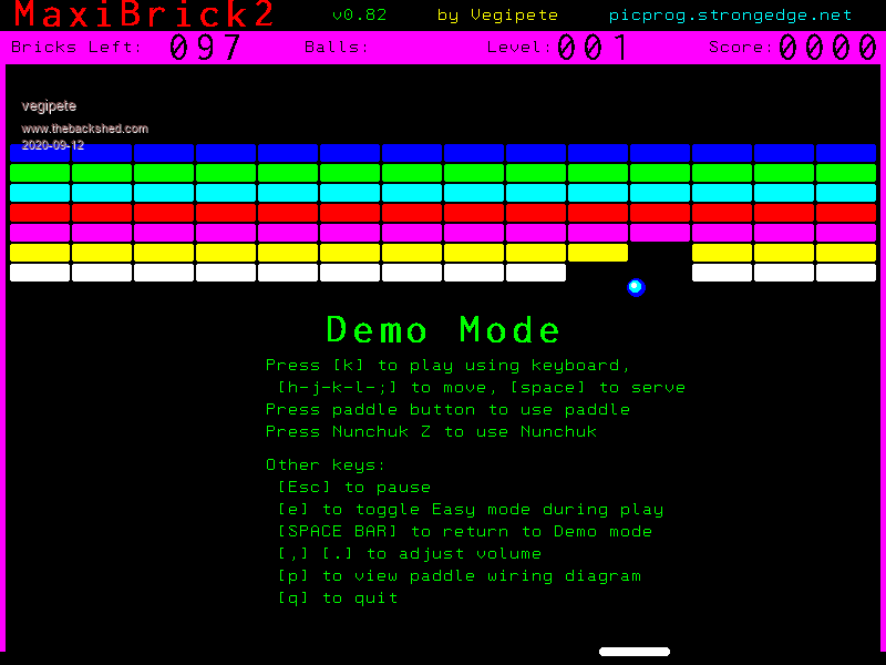 It looks like it has been some seven and a half years since I released MaxiBrick for the Colour Maximite. Well, here is an update: MaxiBrick 2 for the Colour Maximite 2! ![]() The game program is completely self contained; no support files are required. This is playable with keyboard, Nunchuk and game paddle, although a paddle is the only sensible choice. The game itself can show you the required wiring diagram. Twist your wrist when using a Nunchuk. Have at it and let me know if there are any problems. Visit Vegipete's *Mite Library for cool programs. |
