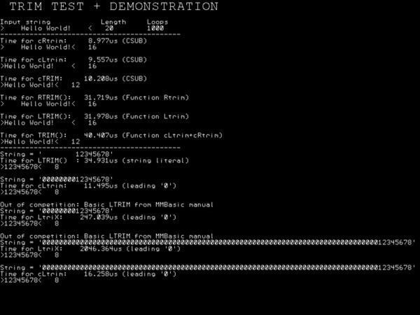 Hi, here are my CSUB versions of Ltrim() and Rtrim() for the CMM2. After all, it's not as versatile as Geoff's useful code example (see manual), but it's significantly faster (~10us). #include "ARMCFunctions.h" #define NULL (void *) 0 void ltrim(char* string, char* b_char) { // Note: doesn't work for string literals // eg ltrim(" test"," ") unsigned char len = (unsigned char)*string; unsigned char i; unsigned char spaces = 0; char* stemp = string;// Save string pointer char bc = ' '; // blank char = ' ' if (string == NULL) // no args = nothing to do return; if (b_char != NULL ) // no blank char arg? Then use default bc = b_char[1]; // Search first non-space character while (spaces < len && *++stemp == bc) { ++spaces; } len -= spaces; // Remaining string length = len - spaces *string = (char)len; // Store BASIC (trimmed) string length for (i=0;i++ <len;) {// Copy the rest of the string string[i] = string[i+spaces]; } return; } #include "ARMCFunctions.h" #define NULL (void *) 0 void rtrim(char* string, char* b_char) { unsigned char len = (unsigned char)*string; unsigned char spaces = 0; char* stemp = string;// copy string pointer char bc = ' '; // default blank char = ' ' if (string == NULL) // no args = nothing to do return; if (b_char != NULL ) // no blank char arg? use default bc = b_char[1]; stemp = stemp+len; // point to the end of the string // Find the first non-space at the end of the string while (spaces <= len && *stemp-- == bc) { ++spaces; } len -= spaces; // Remaining string length = len - spaces *string = (char)len; // Store BASIC (trimmed) string length return; } Demo file and source: CSUB Trim v1.02.zip You can use it as is or as a Function: Function LTRIM(s$) as STRING cLtrim(S$) LTRIM=S$ End Function a$=LTRIM(" Hello World") ? ">"a$"<" >Hello World< and you can eliminate (almost) any leading (or trailing) characters. eg a$="0000000012345678", cLtrim(a$,"0"), Print a$ gives you "12345678" Any feedback appreciated. Regards Michael Edit: CSUB Trim v1.01.zip replaced TRIM (combines rTrim and lTrim) added 1.02 Demo corrected Edited 2020-09-13 17:21 by twofingers causality ≠correlation ≠coincidence |