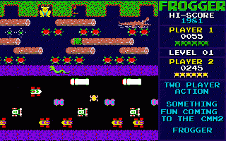 Spending a couple days comping up some ideas. Two player simultaneous combat Frogger. If you jump on your opponent it sends them back to the beginning. Should be super fast to put together on the CMM2.