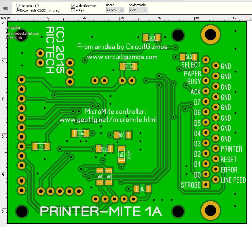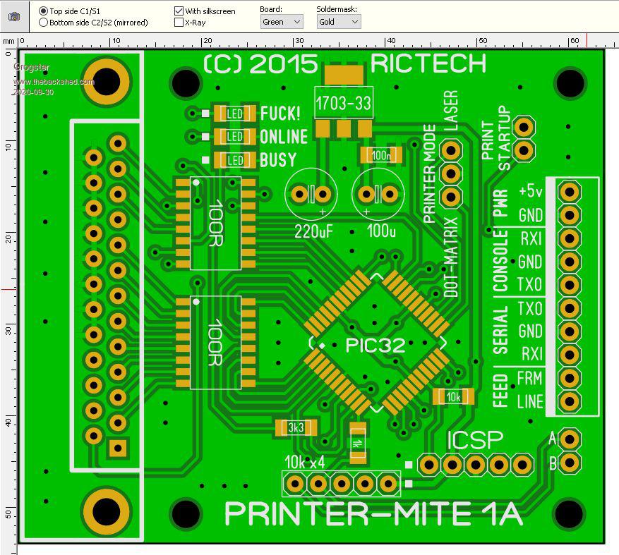 Did that a few years ago. ![]() ![]() ![]() That PCB was designed specifically to buffer data to either a dot-matrix or laser printer, with a parallel port. I never got around to testing/writing code for it to use with laser printers though. Smoke makes things work. When the smoke gets out, it stops! |