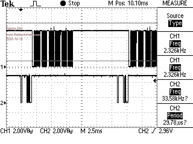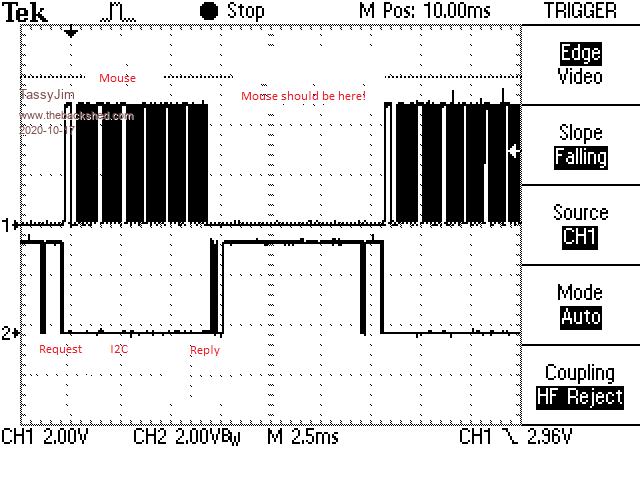 Interesting. Must be an Arduino thing. I'm not having any timing problems with a little PIC chip. That's within the nunchuk protocol, mind you. My I2C routines are entirely interrupt driven. When the ISR has finished sending the I2C data, it sets a flag so the main routine can query the mouse. An entire mouse transaction takes about 6.5 milliseconds. The CMM2 I2C nunchuk transaction takes about 2 milliseconds to send a payload of 6 bytes. The Hobbytronics payload is 10 bytes so hopefully it won't be much more. That should leave lots of time. I guess I'll know for sure tomorrow when I update the firmware. There's something strange about your scope image. I would expect both mouse and I2C to idle high. ![]() Mouse activity on the upper lines, I2C on the lower ones. Visit Vegipete's *Mite Library for cool programs. |