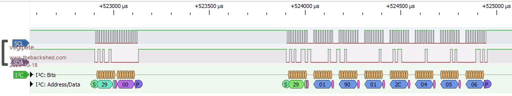 As expected, the Hobbytronics I2C read routine used by the new CONTROLLER MOUSE command works nicely. The overall transaction takes a smidgen over 2 milliseconds, and repeats every 16 ms. The only nuisance I've seen are some occasional single glitches on SDA and/or SCL a few ms before the real show starts. Sometimes this fools my code so I may need to implement a timeout function... ![]() Note, no real data in this yet, I'm still testing for robustness. Visit Vegipete's *Mite Library for cool programs. |