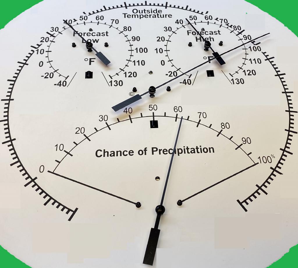 The end result will be a dial about 11 inches diameter, appx 280mm with the main dial showing outdoor temp at the moment and other dials showing indoor temp, min/max temp and chance of precipitation and connect to my weather station to easily see the weather at a distance