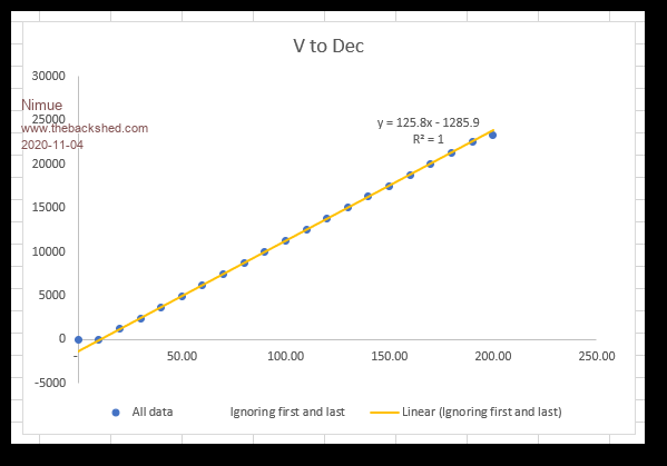 I have a device that accepts volts and squirts out two bytes of data shown below which represent the volts. I sent some accurate volt tests into it and got the following.