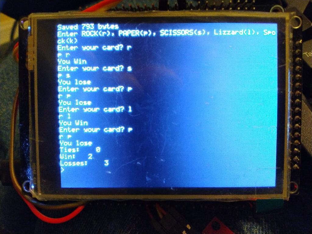 With a PS/2 keyboard on an F4, 320x240 LCD, with OPTION LCDPANEL CONSOLE 7, here's the Rock, Paper, Scissors program: