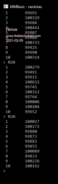 DIM counts(11) DIM INTEGER value, x FOR x = 1 TO 1000000 value=((RND()*10)+1) ' float being cast to integer > uses rounding 'value=int((Rnd()*10)+1) ' this line works as expected due to using INT() counts(value)=counts(value)+1 NEXT x FOR x = 0 TO 11 PRINT x,counts(x) NEXT x Without INT() 0 0 1 49705 2 100084 3 99604 4 99934 5 100502 6 100064 7 100378 8 99552 9 99675 10 100091 11 50411 with INT() 0 0 1 100413 2 99930 3 100133 4 99991 5 99301 6 100013 7 100154 8 100044 9 99733 10 100288 11 0 Jim VK7JH MMedit |