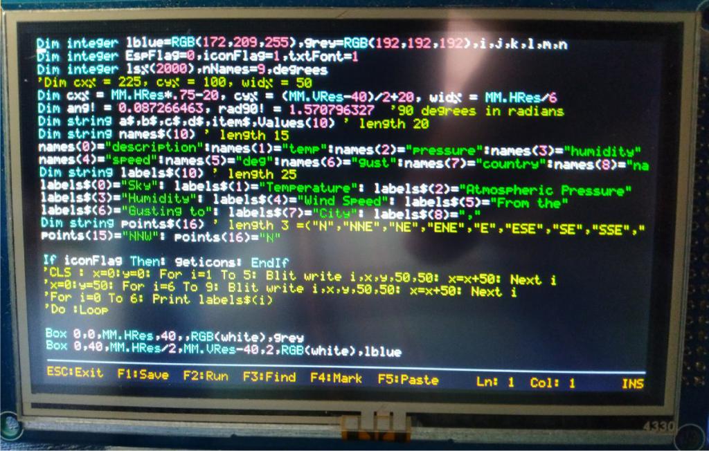 Thanks for the update. That works. After programming firmware on F4 with 4.3" 480x272 LCD: OPTION LCDPANEL DISABLE OPTION LCDPANEL SSD1963_4_16,L [Power cycle] OPTION TOUCH PB12, PC5 gui calibrate F10 [AUTOSAVE] (after selecting my code on the PC) Ctrl-Z [save program] F2 [run] Ctrl-C [quit] F2 [run again] ![]() (As ever, the LCD is crisp, though photo from my phone is mangled.) Perhaps it is greedy to look for a path forward after this very welcome update, but here goes. (First, this is also my favorite micromite--great price, great functionality.) The Armmite F4 is a good candidate for a standalone "MMBasic computer" with a keyboard added and an LCD. Unfortunately, the 320x240 LCD which is readily available to order with the STM32F407VET6 allows lines only 53 characters wide with OPTION KEYBOARD and OPTION LCDPANEL CONSOLE 7 (the smallest available font, 6x8). The 4.3-inch SSD1963 (which requires an adapter board), is fine, with 480x272 pixels, which works out to an edit screen of 80x25 characters. ![]() But that LCD and the even better 5" & 7" 800x600 are quite expensive for the 20-pin versions--$34 U.S. with shipping at a minimum (and require an adaptor). To me, a much better fit would be the 480x320 SPI ILI9488, which would give an 80x40ish edit screen with font 7. Of course, it would also require a backpack to bring out the interface pins. I would propose to design one which would also include a PS/2 keyboard connector, socket for RTC & ESP-01, mini-stereo socket, IR capability, and a 20x2 pi-type connector like that on the CMM2. The 3.5" ILI9488 can be had for $10US including shipping. There is apparently a 'loadable' driver for this LCDI think for the MM+ (and perhaps MMX). This would make a very capable "MMBasic computer"). On the firmware side, if space is available, JSON$ and FIELD$ would be helpful. Perhaps BLIT WRITE could be modified so that it could be used either without height and width specified (CMM2 style), or with those (for compatibility). If SPRITE could be accepted as an alias for BLIT, that would help in porting certain programs from and to the CMM2. With regard to hardware, support for the STM32 "black pill" (which almost works ) would be valuable. If the "blue pill" is an example, the black pill will be around for a long time. With an appropriate backpack PCB, that could provide much of what the STM32F407VET6 PCB does except for the high-speed LCD. I understand that the CMM2 is a much hotter game if there is more on the burner there. As always, thanks very much for your great work on MMBasic. ~ Edited 2021-02-10 07:28 by lizby PicoMite, Armmite F4, SensorKits, MMBasic Hardware, Games, etc. on fruitoftheshed |
