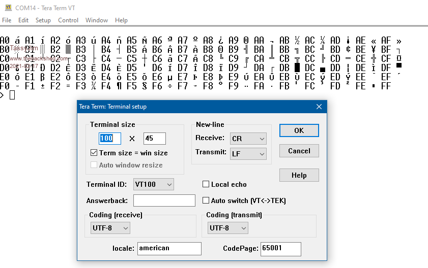 Quote  I suggest that you have some odd setting in your teraterm.ini file. Delete it and start fresh.