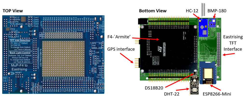 The modules are mounted on the UNDERSIDE of the board to minimise the thickness of the `stack' of boards. Using standard size headers the `stack' is approx 25mm from the back of the TFT panel to the top of the F4-ER, thus enabling the assembly to be mounted inside a much thinner case than if the modules were mounted on the top.