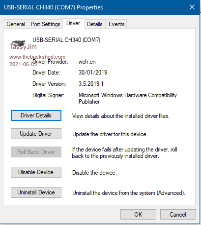 Have a project that uses the CH340 USB-Serial interface between PC and project. This has been very reliable up until recently where the serial port would be lost and the program had to be reset and restarted. I did a bit of inet reading and a couple of people mentioned that they had similar problems until upgrading the CH340 driver. I hunted high and low and couldn't find a more recent driver for the 2019 version I had on the Windows 10 PC. Out of desperation I hunted and found an earlier version dated 2011 and when I installed it everything was good again. This lasted a couple of days and the trouble resurfaced. Doing some detective work it seemed that the serial port was lost exactly 8 minutes after the program started so I was convinced that the issue was with the PC caused by some timer in Windows 10. Looking at the driver revealed that Microsoft updates had in its wisdom replaced the 2011 driver with the 2019 version which has the issue. Re-installing the 2011 version fixed the issue and telling Windows 10 not to update drivers when doing other updates hopefully will keep the peace. Thought I would share this experience so that hair pulling out may be minimized. OA47 |