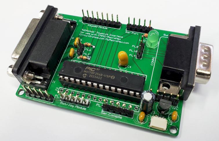 The NONchuk board provides a way to interface joysticks and other devices to the RetroMax. The intention is to use the I2C port on the NONchuk to connect to the Nunchuk interface on the RetroMax (or CMM2). The NONchuk allows the Nunchuk port of the RetroMax to connect to joysticks and several other devices. Since there are a variety of different devices that can be connected, the NONchuk uses a MicroMite chip (the '170 with MMBasic installed) to run code for the task. The NONchuck has a console port that can be used as the serial interface for programming the MMBasic code specific to how the NONchuk will be used.