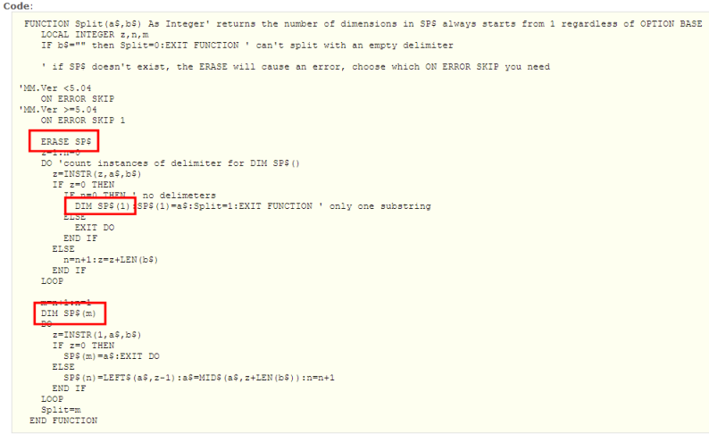 In the red boxes, the array is ERASEd and then DIMed in one of two places. The new array becomes available outside the Function. This simulates the VB REDIM statement.
