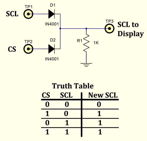 Hi Mick, All, I had a little think about this, I think this might work for you (haven't tested it) Use a couple of schottky diodes and a pull down resistor. You may have to fiddle with the pull down value a bit but it logically looks ok to my feeble brain. You wont get an SCL signal to your display unless BOTH the SCL is low and the CS is low ![]() Regards, The other Mick Mick's uMite Stuff can be found >>> HERE (Kindly hosted by Dontronics) <<< |