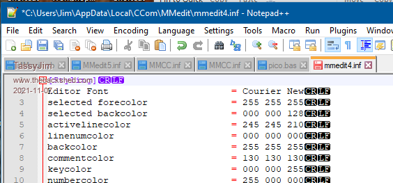 Yes. But you can do that now. Edit the first line of the mmedit4.inf file ![]() Anything that is not a mono spaced font will not work well. Jim VK7JH MMedit |