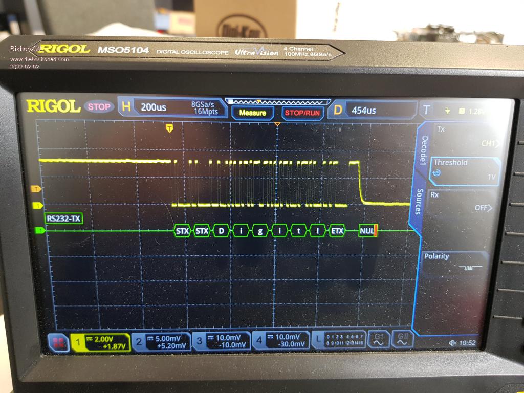 I suspect the NUL is just your analyser doing its best to make sense of the incorrect state and not a "real" character - the very slow fall doesn't match the rest of the data edges