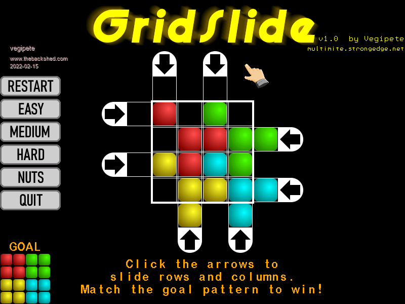 Here's a quickie based on an idea from a recent Hackaday post. You can slide rows and columns to shuffle tiles around. The goal is to return to the original pattern. I suppose this is a bit like a cross between a Rubik's Cube and one of the numbered tile slide puzzles. Comments and bug reports are welcomed. Extract the two files to the same place and run. Requires a PS/2 mouse. GridSlide.zip ![]() Visit Vegipete's *Mite Library for cool programs. |