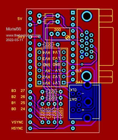 This should plug into the RH end of the backplane. It accepts a 5V PS/2 keyboard and does the necessary level shifting. Note that the sockets overhang so it has to be the end of the board. The VGA socket is the compact version, which I've not found in the UK but they are easy enough to get from Chinese suppliers. I could just do to check it over, but I think it's ok. You can get 3 of these out of a 100x100 board if they panelize them or 4 if you cut the board yourself. This is the special offer size at JLCPCB so you get 5 boards very cheaply. For those who are comparing it with the PicoMite pin layout, this backplane mirrors the PicoMite connections so left & right are reversed. EDIT: I think it's ok. :) PS2-vga adapter-gerbers.zip Edited 2022-03-11 05:34 by Mixtel90 Mick Zilog Inside! nascom.info for Nascom & Gemini Preliminary MMBasic docs & my PCB designs |