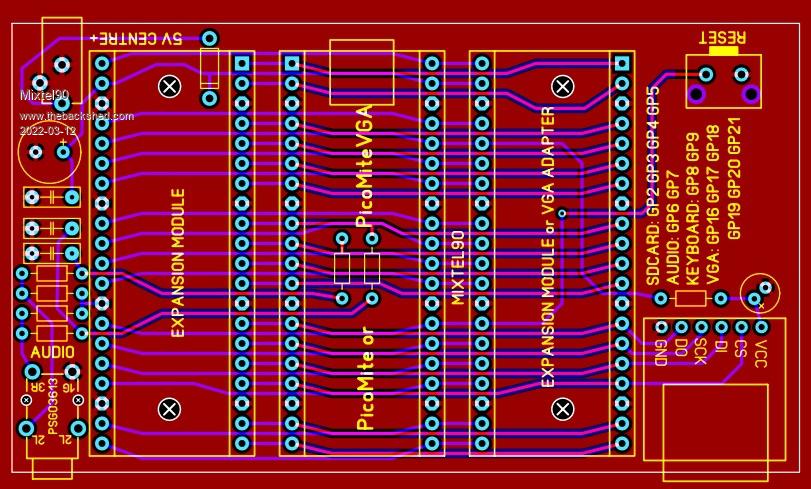 You should be able to put the components for a PicoMite VGA onto a suitable board to fit your backplane (although the VGA and PS/2 connectors might need some imagination). There are only a few resistors in addition to that. Note that you have to run the VGA version of the PicoMite firmware in order to use VGA. The normal version won't work. The pins on the PicoMite VGA for the PS/2 keyboard and VGA output are fixed - you can't change them. If there are conflicts with something else then that something else has to change. PS/2 CLK - 11 PS/2 DAT - 12 VGA HSYNC - 21 VGA VSYNC - 22 VGA bit0 - 24 VGA bit1 - 25 VGA bit2 - 26 VGA bit3 - 27 If I were you I think I'd look for breakout boards for PS/2 and VGA then try to arrange them along the low-numbers side of a piece of padboard the same size as a PicoMite, leaving a gap for pins 11 & 12. Then you can put headers on both sides of it so that it plugs in on the right-hand side of the PicoMite so the sockets are accessible. Actually, this sounds like a nice little project for a PCB design. I might see if it's feasible. Edited 2022-03-09 22:47 by Mixtel90 Mick Zilog Inside! nascom.info for Nascom & Gemini Preliminary MMBasic docs & my PCB designs |