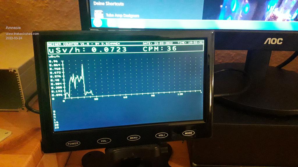 I have a similar kind of Geiger-meter (RadiationD v1.1 CAJOE from AliExpress) connected to PicoMiteVGA. My initial problem was to have Pico to recognize the pulses. The pulse out from Geiger is a short dip to "0V" and 5V between the pulses. I tried with serial resistor on the input to Pico; many pulses were missed. The final solution was to put a 47k potentiometer across the Geiger output and connect the wiper to PicoMite's input and adjust the idle voltage to about 3V. That seems to allow Pico to catch all pulses. I am counting pulses over a 10 minute period before plotting and saving to SD-card. Normal level is about 200 pulses/10minutes. ![]() Only recording nbr of pulses; No calibration to real radiation level. Tested by keeping a Americum radiation source from a smokealarm close to the tube and there was an enormous increase in pulse rate. I hope to never see that under normal (abnormal) measurement conditions! /Fred |