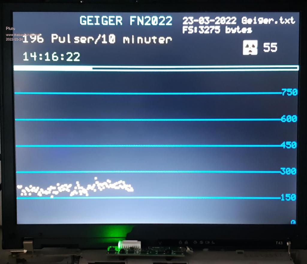 This is my Geiger-code: 'MMEDIT!!! Basic Version = Pi_5.05.01 'MMEDIT!!! Port = COM28:38400:10,300 'MMEDIT!!! Device = Pi_5.05.01 'PicoMiteVGA. Displays Geiger-counter data on VGA-display. 'Counts the Geiger-pulses over 10minutes and displays data. 'Stores data on SD-card for each 10 minute period. 'RadiationD v1.1(CAJOE). Output from Geiger via headphone jack. '47k potentiometer used as voltage divider for input to PicomiteVGA. 'GP6 is used for pulse counting. 'RTC module for time. DS3231M module (note: diode not removed.) 'Fred 15.3.2022. 'setpin GP0,GP1,I2C RTC GETTIME cls TEXT mm.hres/2-30,10,"GEIGER FN2022 ","CM",1,1,rgb(cyan) dim Colors(9)=(RGB(yellow),RGB(RED),RGB(magenta),RGB(cyan),RGB(green),0,0,0,0,0) i=1 j=0 'For changing graph color when x-axis goes back from 320 to 0. Period=10*60*1000 'measurements collected over 10 minutes. 'Period=60*1000 'For debugging Ygrid OldPulCnt=0 'GUI LED #1,Puls,mm.hres*7/8,50,10,RGB(red) Circle mm.hres*7/8-15,40,10,1,1,RGB(red),rgb(bLACK) load JPG "Radiation2.jpg",mm.hres*7/8-22,32 'Circle mm.hres*7/8-15,40,5,1,4,RGB(red),-1 'Circle mm.hres*7/8-15,40,20,1,0.35,RGB(red),-1 'open "Geiger2.txt" for append as #1 DataFileName 'Create a name for the file where data is stored do timer=0 setpin GP6, CIN 'GP6 is one of the default counting pins. do text 10,50,time$,"LM",1,1,RGB(green) ProgressBar 'Shows the progress of the 10 minutes measurement period. NewPulCnt=pin(GP6) IF NewPulCnt>OldPulCnt then OldPulCnt=NewPulCnt Circle mm.hres*7/8-15,40,10,1,1,RGB(red),rgb(RED) 'indicator for rcvd pulse. text mm.hres*7/8,40,STR$(NewPulCnt)+" ","LM",1,1,RGB(white) Pause 100 'Just to keep the indicator briefly on. Circle mm.hres*7/8-15,40,10,1,1,RGB(BLACK),rgb(BLACK) load JPG "Radiation2.jpg",mm.hres*7/8-22,32 end if 'pause 500 loop until Timer>=Period OldPulCnt=-1 timer=0 Pulser=PIN(GP6) BOX i,(mm.vres-Pulser/5),2,2,1,Colors(j),Colors(j) TEXT 10,30,str$(Pulser)+" Pulser/10 minuter ","LM",1,1,rgb(Yellow) open NewFileName$ for append as #1 print #1, Date$+","+Time$+","+STR$(Pulser) Close #1 FS$=str$(mm.info$(filesize NewFileName$)) 'Size of present data-file. Text 190,20,"FS:"+FS$+" bytes ","LM",7,1,rgb(white) i=i+1 if i>320 then i=1:j=j+1 IF j>=4 then j=0 pin(GP6)=0 loop 'close #1 end sub DataFileName NewFileName$=Date$+" Geiger.txt" Text 190,10,NewFileName$,"LM",7,1,rgb(white) end sub sub ProgressBar IF Timer<1000 then BOX 0,60,mm.hres,5,1,RGB(cyan),RGB(black) box 0,60,mm.hres*timer/Period,5,1,RGB(cyan),rgb(Cyan) end sub SUB Ygrid xres=mm.hres yres=mm.vres 'line 0,yres,xres,yres,1,rgb(gray) 'line 0,yres/8,xres,yres/8,1,rgb(gray) 'line 0,yres*2/8,xres,yres*2/8,1,rgb(gray) line 0,yres*3/8,xres,yres*3/8,1,rgb(BLUE) line 0,yres*4/8,xres,yres*4/8,1,rgb(BLUE) line 0,yres*5/8,xres,yres*5/8,1,rgb(BLUE) Line 0,yres*6/8,xres,yres*6/8,1,rgb(BLUE) line 0,yres*7/8,xres,yres*7/8,1,rgb(BLUE) PAUSE 10 'pause for making the whole gr 'text xres-60,yres/8,"3.5","LM",3,1,rgb(Yellow) 'text xres-60,yres*2/8,"3.0","LM",3,1,rgb(Yellow) text xres-0,yres*3/8,"750","RM",7,1,rgb(BLUE) text xres-0,yres*4/8,"600","RM",7,1,rgb(BLUE) text xres-0,yres*5/8,"450","RM",7,1,rgb(BLUE) text xres-0,yres*6/8,"300","RM",7,1,rgb(BLUE) text xres-0,yres*7/8,"150","RM",7,1,rgb(BLUE) text xres-0,yres*8/8,"0","RM",7,1,rgb(BLUE) 'text xres-0,0,"4.0","LM",1,2,rgb(Yellow) 'for k=0 to xres step 200 'for m=0 to yres step yres/40 'text k,m,"+","CM",1,1,rgb(gray) 'next m 'next k end sub When the graph has reached the right end of the screen, it will jump back to start and plot the next set of data with an other color. In that way there can be a quite long datatrend visible and it is easy to see if there is something else than background scattering. Just above the graph is a 10minute long progress bar. Just to see when following datapoint is to be expected. I bought the Geiger-board several years ago and it has kindly rested in a box on the shelf until recently. Yellow dots and blue grid came just by "accident", but I recognize now that these are also the Ukrainian colors! /Fred |
