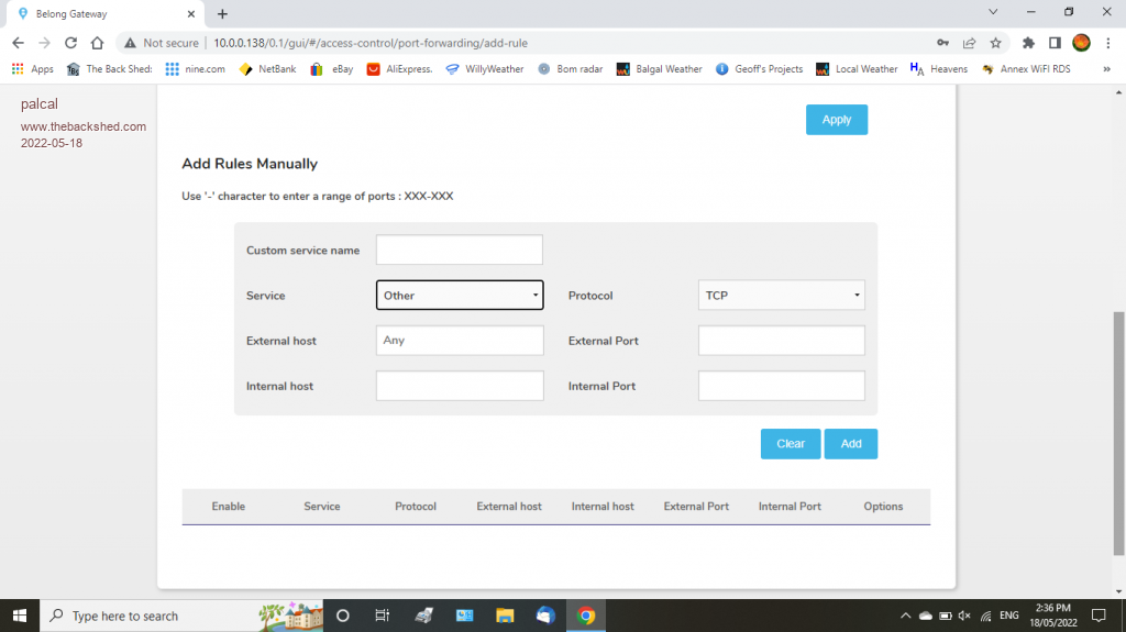 Some time ago I built an alarm using a radar module an E-28 and an ESP8266. I could switch it on and off using my phone and it would send me an email if triggered. I had to use port forwarding and have changed my service provider so have to set port forwarding again. ![]() Can someone tell me what I have to put in the above fields. . Edited 2022-05-18 14:38 by palcal "It is better to be ignorant and ask a stupid question than to be plain Stupid and not ask at all" |