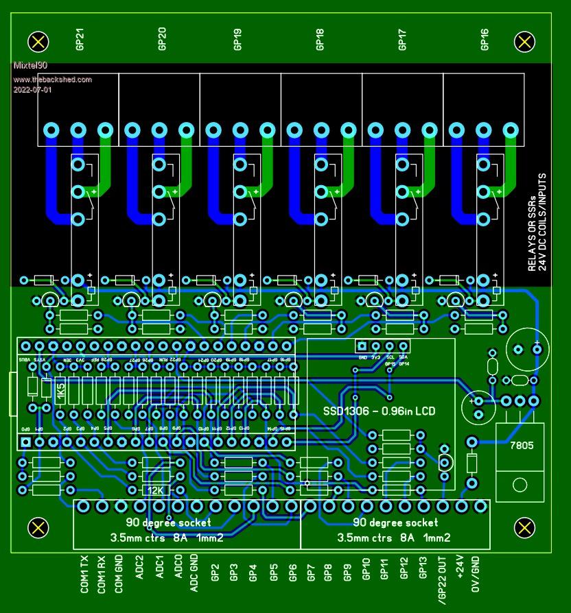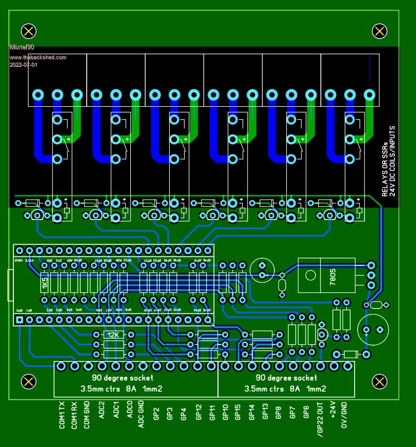 This isn't likely to be of much interest commercially anyway. Look at the time and labour cost involved in soldering all those components and you realize that ordering a ready made unit from RS or somewhere isn't really all that much more expensive. It might be fun for a hobbyist though. As such I'm not particularly bothered about input protection. The Pico board is cheap enough to just swap out if you blow one up - it would cost more than a new Pico to add the extra components. :) Also, I think that for someone who is learning, active low inputs and outputs are the "wrong way round". They are fine technically, but not logical. I'm unlikely to build this, by the way - I've no use for one. It's just a design to play with. :) Here's a revision where I got the GP inputs in order, gave the outputs series & pull-down resistors and added a little display to indicate inputs and outputs or whatever (because there were two pins left for I2C :) Not sure if that display has its own pull-ups though.). Incidentally - the only reason it has a 24VDC supply is that some SSRs in particular aren't available with 5V inputs (and low voltage relay coils need more current). It makes it look like an industrial unit too. :) EDIT: This version also has protection on the serial port connection. I thought it might be a good idea. :) Edited 2022-07-01 16:51 by Mixtel90 Mick Zilog Inside! nascom.info for Nascom & Gemini Preliminary MMBasic docs & my PCB designs |