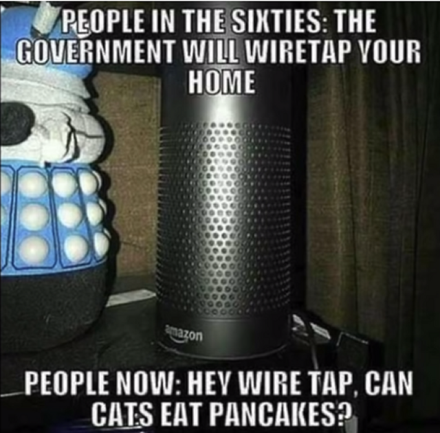 hah! I said exactly this to a friend a while back when he was going to get an "Alexa" (shakes head) - "If the government said everyone had to have a listening device in their homes, there would be uproar. Give it a cute name and charge people $99 for it and they'll line up in droves." YT is replete with vids of Alexa being asked awkward questions and it either refuses to answer or outright lies. |