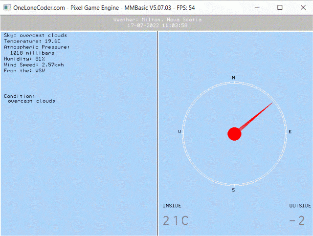 From the work of Lew247, matherp, and others. ![]() In the lower right, outside and inside temperatures are hard coded, since no pins for connecting DS18B20s with MMBasic for Windows. At one time I had a web page set up on another device which had those readings, and another version of this program (F4, I think) got them--but I've lost track of that, so in this example they're unchanging awaiting revision (though I could just plug in the openweathermap.org temperature for "outside"). The code (MYID$ and APIKEY$ values need to be replaced for your locale) mode 1 ' mode 1 600x480; 2 320x240 dim string cpu="W" ' windows Dim integer lblue=RGB(172,209,255),grey=RGB(192,192,192),i,j,k,l,m,n Dim integer EspFlag=1,iconFlag=1,firstPassFlag=1,txtFont=1,ESPOKFlag% Dim integer ls%(1000),nNames=10,degrees, x_endpoint, y_endpoint Dim integer outsideTemp=-2, insideTemp=21, OldOutsideTemp, OldInsideTemp 'Dim cx% = 225, cy% = 100, wid% = 50 Dim cx% = MM.HRes*.75-5, cy% = (MM.VRes-40)/2+22, wid% = MM.HRes/6 Dim ang! = 0.087266463, rad90! = 1.570796327 x'90 degrees in radians Dim string a$,b$,c$,d$,e$,http$,minute$,second$,item$,weathGet$,qt=chr$(34),Values(10) length 20 Dim string names$(10) length 15 names(0)="description":names(1)="temp":names(2)="pressure":names(3)="humidity" names(4)="speed":names(5)="deg":names(6)="gust":names(7)="country":names(8)="name" names(9)="icon" Dim string labels$(10) length 25 labels$(0)="Sky": labels$(1)="Temperature": labels$(2)="Atmospheric Pressure" labels$(3)="Humidity": labels$(4)="Wind Speed": labels$(5)="From the" labels$(6)="Gusting to": labels$(7)="City": labels$(8)="," Dim string points$(16) length 3 =("N","NNE","NE","ENE","E","ESE","SE","SSE","S","SSW","SW","WSW","W","WNW","NW","","") points(15)="NNW": points(16)="N" Dim string iconCodes$="01d02d03d04d09d10d11d13d50d" Dim integer pInTemp=1,iFailedCnt,iEspStage,wOrgFailedFlag=1 Dim MYID$="YOUR_ID" ' Liverpool, Nova Scotia Dim APIKEY$="YOUR_KEY" Dim report$="weather", URL$="api.openweathermap.org" http$= "GET /data/2.5/"+report$+"?id="+MYID$+"&APPID="+APIKEY$ http$=http$+" HTTP/1.0"+Chr$(13)+Chr$(10)+Chr$(13)+Chr$(10) If iconFlag Then: geticons: EndIf If MM.HRes=320 Then: txtFont=7: EndIf Box 0,0,MM.HRes,40,,RGB(white),grey Box 0,40,MM.HRes/2,MM.VRes-40,2,RGB(white),lblue Box MM.HRes/2+1,40,MM.HRes/2,MM.VRes-40,2,RGB(white),lblue Text MM.HRes/2,5,"Weather: Milton, Nova Scotia",C,1,,RGB(white),grey Text MM.HRes/2,20,Date$+" "+Time$,C,1,,RGB(white),grey compass_rose cx%,cy%,wid% getWeather writeScreen a$=Mid$(Time$,4,2) ' get minutes i=Val(a$) MOD 15 If i < 5 Then: firstPassFlag=0: EndIf ' GET won't violate 10 minute rule Do a$=Mid$(Time$,7,2) ' get second If second$<>a$ Then Text MM.HRes/2,20,Date$+" "+Time$,C,1,,RGB(white),grey second$=a$ a$=Mid$(Time$,4,2) ' get minute If minute$<>a$ Then minute$=a$ If wOrgFailedFlag OR minute="00" OR minute="15" OR minute="30" OR minute="45" Then ' get weather If firstPassFlag Then firstPassFlag=0 ' don't violate "no more than once every 10 minutes" rule Else getWeather writeScreen EndIf EndIf EndIf EndIf if CPU<>"W" then: i=TEMPR(pInTemp): If i<>1000 Then: insideTemp=i: EndIf: Endif If oldInsideTemp<>insideTemp Then oldInsideTemp=insideTemp Text MM.HRes/2+13,MM.VRes*.80,"INSIDE",,txtFont,,RGB(black),lblue Text MM.HRes/2+10,MM.VRes*.85,Str$(insideTemp)+"C",,5,,RGB(gray),lblue logTmp EndIf If oldOutsideTemp<>outsideTemp Then oldOutsideTemp=outsideTemp Text MM.HRes-65,MM.VRes*.80,"OUTSIDE",,txtFont,,RGB(black),lblue Text MM.HRes-70,MM.VRes*.85,Str$(outsideTemp),,5,,RGB(gray),lblue EndIf Loop Sub writeScreen x=10:y=45 For i=0 To 6 If i=2 Then Text x,y,labels$(i)+": ",,txtFont,,RGB(black),lblue:y=y+15 Text x,y," "+Values$(i),,txtFont,,RGB(black),lblue:y=y+15 Else if Values$(i)<>"" then Text x,y,labels$(i)+": "+Values$(i),,txtFont,,RGB(black),lblue):y=y+15 endif EndIf Next i Circle cx%,cy%,wid%-6,,,lblue,lblue Circle cx%,cy%,wid%/8,,,RGB(red),RGB(red) ' center n=((630-degrees) MOD 360) ' opposite of direction of wind '' Text x,225,"Wind to "+Str$(n),,txtFont,,RGB(black),lblue n=((degrees+180) MOD 360) ' opposite of direction of wind For i=-3 To 3 ' lines offset from center (cx%) to make arrow x_endpoint=(cx%)+(Cos(n/5*ang!)*(wid%-8)) ' ang! = 0.087266463 (5 degrees) y_endpoint=(cy%)-(Sin(n/5*ang!)*(wid%-8)) Line (cx%+i),(cy%+i),x_endpoint,y_endpoint,,RGB(RED) Line (cx%-i),(cy%-i),x_endpoint,y_endpoint,,RGB(RED) ' Line (cx%+i),(cy%+i),(cx%)+(Cos(n*ang!)*(wid%-8)),(cy%)-(Sin(n*ang!)*(wid%-8)),,RGB(RED) Next i ' text x,200,"Condition: ",,txtFont,,rgb(black),lblue ''do until inkey$<>"": loop Text x,200,"Condition: "+Values(9),,txtFont,,RGB(black),lblue iconFlag=0 if Values$(9)<>"" then For i=0 To 8 ' check icon availability a$=Mid$(iconCodes$,i*3+1,3) ' print a$+"="+Values(9)+"? "; If a$=Values$(9) Then: iconFlag=i+1: Exit For : EndIf Next i endif If iconFlag Then Blit write iconFlag,MM.HRes/4,180,50,50 Else Text x+10,212,Values$(0),,txtFont,,RGB(black),lblue EndIf End Sub Sub compass_rose cx%,cy%,wid% Local a% Text cx%-6,cy%-wid%-16),"N",L,1,,RGB(1,1,1),lblue Text cx%-6,cy%+wid%+5,"S",L,1,,RGB(1,1,1),lblue Text cx%+wid%+5,cy%-11,"E",L,1,,RGB(1,1,1),lblue Text cx%-(wid%)-10,cy%-11,"W",L,1,,RGB(1,1,1),lblue If a%<>a% Then Text 10,10,"NE",L,7,,RGB(1,1,1),RGB(134,174,230) Image rotate 6,4,30,30,cx%+(wid%-16)*Cos(.785),cy%-(wid%-16)*Cos(.785),45,1 Text 10,10,"SE",L,7,,RGB(1,1,1),RGB(134,174,230) Image rotate 6,4,30,30,cx%+(wid%-16)*Cos(.785),cy%+(wid%-16)*Cos(.785),135,1 Text 10,10,"SW",L,7,,RGB(1,1,1),RGB(134,174,230) Image rotate 6,4,30,30,cx%-(wid%-16)*Cos(.785),cy%+(wid%-16)*Cos(.785),225,1 Text 10,10,"NW",L,7,,RGB(1,1,1),RGB(134,174,230) Image rotate 6,4,29,29,cx%-(wid%-16)*Cos(.785),cy%-(wid%-16)*Cos(.785),315,1 Text 10,10," ",L,7,,RGB(134,174,230),RGB(134,174,230) ' clear text ' tick marks, every 5 degrees (360/5 = 72) EndIf For a% = 0 To 71 ' note: for angles, East is zero Line (cx%)+(Cos(a%*ang!)*(wid%-4)),(cy%)-(Sin(a%*ang!)*(wid%-4)),(cx%)+(Cos(a%*ang!)*(wid%+1)),(cy%)-(Sin(a%*ang