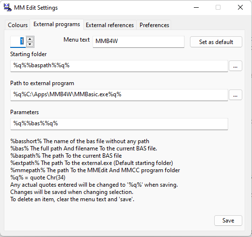 MMEdit5 Action/Edit list ![]() Change the spin-box up to the next available spot That will be '1' if you haven't added any other external programs. Menu text = MMB4W Starting folder = %q%%baspath%%q% Path to external program = %q%C:\Apps\MMB4W\MMBasic.exe%q% You will have to edit the path to point to your MMBasic.exe location Parameters = %q%%bas%%q% You might as well click on "set as default" so the run in DOS button changes to MMB4W Jim VK7JH MMedit |