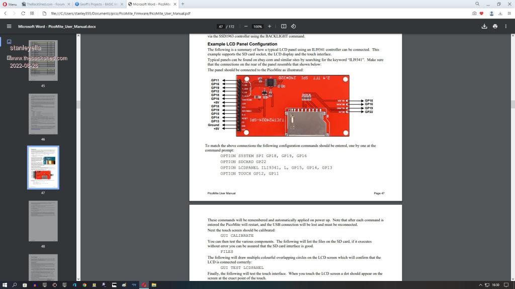 Edit: Looking at Geoff's site, where you speak about '140 pages', I think you are looking at the VGA version of the Picomite which outputs to a VGA monitor. If you want to output to any of the common LCD displays (from 0.96" up to 9") then you need to refer to the manual above - both versions of the Picomite running MMBasic use the same Raspberry Pi Pico module but the firmware for the VGA version is different from the LCD display version (and the VGA version does not support any of the LCD displays referred to above).