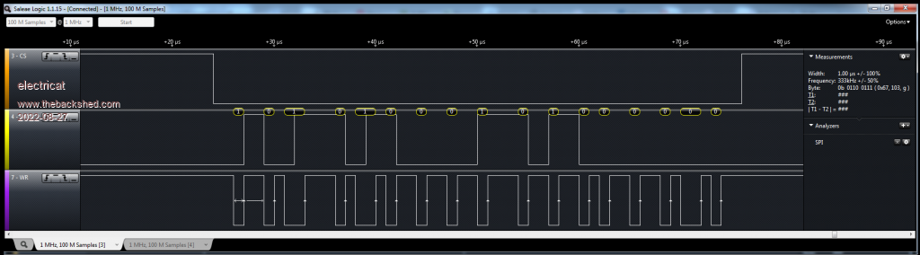 Using logic analyser I reverse engineered custom LCD driven by HT1621. It would be easy task for any PIC microcontroller I am comfortable enough to decode such stream, but what about PicomiteVGA ? Was thinking attach in the middle to signals sent by microcontroller to HT1621. Read data, decode and send to VGA screen using PicomiteVGA :) DATA is clocked out on rising edge of WR signal at every 1-2 uS . It is pack of 17 bits sent in 50 uS x 10 bursts totaling in about 1mS for all pack of LCD information. I failed read data using interrupts at 1uS rate with PicomiteVGA. It might easily be my incompetence in MMBASIC for PicomiteVGA of course. But is it technically possible deal with interrupts without jitters at 1uS rate at all ? ![]() Edited 2022-08-27 19:17 by electricat My MMBasic 'sand box' |