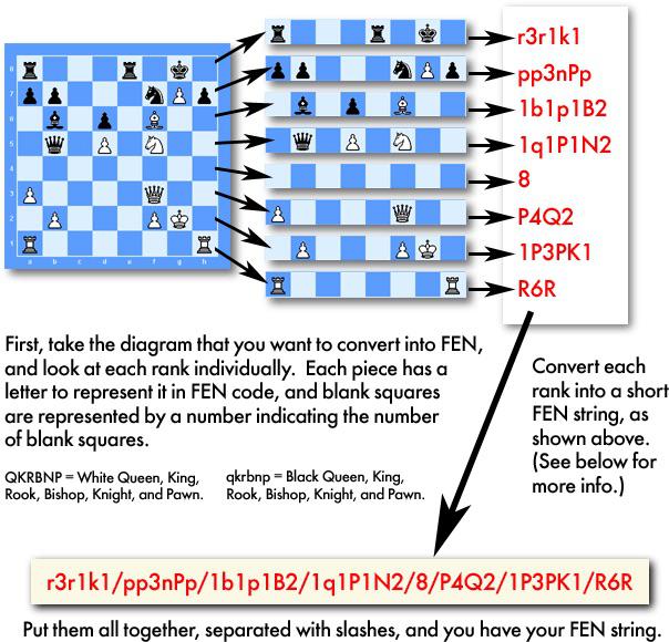 I am developing two Chess Puzzles programs for Color Maximite 2. The first one will feature 2000 puzzles taken from various sources. The second one will include about 1.6 million puzzles. The user provides the name of the PGN file and then the program retrieves a random puzzle from that file. The user guesses the best line of play and presses the enter key or space bar when ready to see the solution. The user again presses one of those keys to retrieve another puzzle. Forsyth-Edwards Notation, which is utilized in one of my programs, is explained in the picture below.