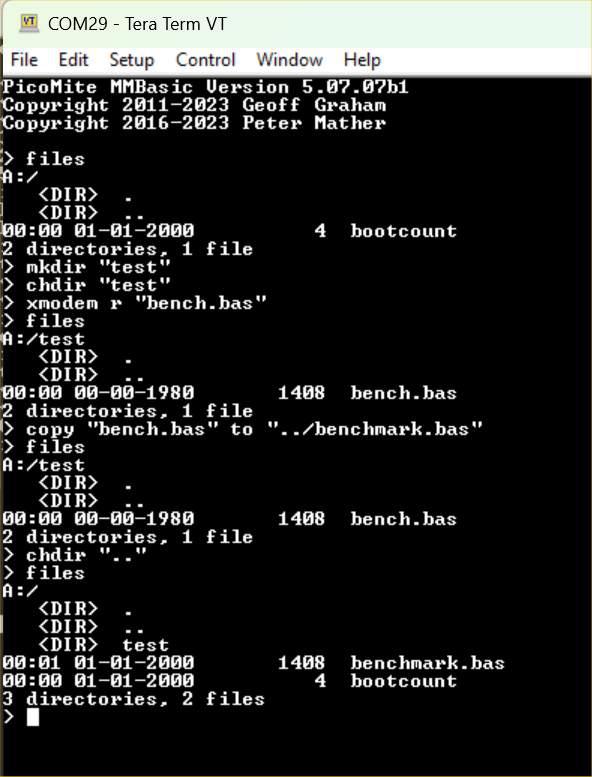 > files A:/ <DIR> . <DIR> .. 00:00 01-01-2000 4 bootcount 2 directories, 1 file > mkdir "Test" > files A:/ <DIR> . <DIR> .. <DIR> Test 00:00 01-01-2000 4 bootcount 3 directories, 1 file > chdir "test" Error : Could not find the path > chdir"Test" Error : Could not find the path > rmdir "Test" > files A:/ <DIR> . <DIR> .. 00:00 01-01-2000 4 bootcount 2 directories, 1 file > mkdir "test" > files A:/ <DIR> . <DIR> .. <DIR> test 00:00 01-01-2000 4 bootcount 3 directories, 1 file > chdir "test" > picomite with latest beta drive a: CHDIR only works with directory name in lower case. Other commands appear to work normally. Jim VK7JH MMedit |