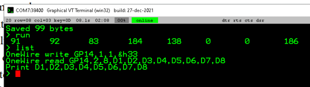 It does sound cool - like shooting down an Arduino. :) Shouldn't need it though. The ONEWIRE commands look pretty straightforward. You just need some sort of SUBs and FUNCTIONs to handle the setup, block protection etc. Mick Zilog Inside! nascom.info for Nascom & Gemini Preliminary MMBasic docs & my PCB designs |